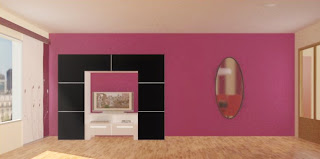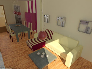 - Salón moderno: la distribución es igual, se sigue usando el mismo tapizado para las sillas y el sofá, combinando la chaise-lounge con las sillas. En cambio se opta por usar un mueble bajo y pequeños armarios y estanterías en color ceniza para que resalten sobre la pared de color rojo vino.