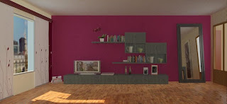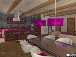 - Salón moderno: la distribución es igual, se sigue usando el mismo tapizado para las sillas y el sofá, combinando la chaise-lounge con las sillas. En cambio se opta por usar un mueble bajo y pequeños armarios y estanterías en color ceniza para que resalten sobre la pared de color rojo vino.
